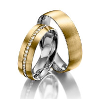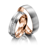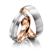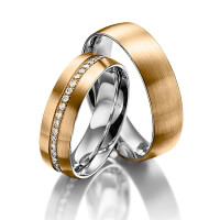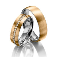 Paar Memoire-Trauringe/Eheringe von Steinberg in außen Weißgold 585/- , innen Rotgold 585/- Oberfläche: längsmatt, poliert mit zus. 0,23 ct. Brillant tw, si (Produkt 1 mit Steinbesatz, Produkt 2 ohne Steinbesatz)