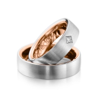 Paar Trauringe/Eheringe von acredo in außen Platin 950/- , innen Rotgold 750/- Oberfläche: längsmatt, poliert mit zus. 0,12 ct. Prinzess-Diamant tw, si (Produkt 1 mit Steinbesatz, Produkt 2 ohne Steinbesatz)