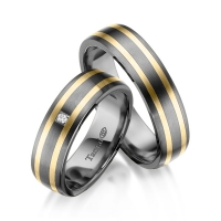 Paar Trauringe/Eheringe in Innen Tantal 900/- , außen Tantal 900/- Gelbgold 750/- Oberfläche: poliert, längsmatt mit zus. 0,04 ct. Brillant tw, si (Produkt 1 mit Steinbesatz, Produkt 2 ohne Steinbesatz)