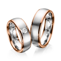 Paar Trauringe/Eheringe von acredo in Roségold 585/- Graugold 585/- Oberfläche: poliert, längsmatt mit zus. 0,15 ct. Brillant tw, si (Produkt 1 mit Steinbesatz, Produkt 2 ohne Steinbesatz)