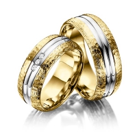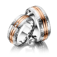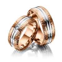 Paar Trauringe/Eheringe von Merii in Rotgold 585/- Weißgold 585/- Oberfläche: gehämmert poliert, poliert mit zus. 0,06 ct. Brillant tw, si (Produkt 1 mit Steinbesatz, Produkt 2 ohne Steinbesatz)