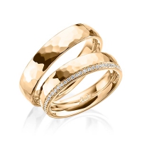 Paar Memoire-Trauringe/Eheringe von Steinberg in Rotgold 585/- Oberfläche: grob gehämmert poliert mit zus. 0,145 ct. Brillant tw, si (Produkt 1 mit Steinbesatz, Produkt 2 ohne Steinbesatz)