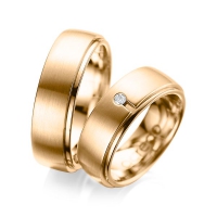 Paar Trauringe/Eheringe von acredo in außen Roségold 585/- , innen Roségold 585/- Oberfläche: längsmatt, poliert mit zus. 0,03 ct. Brillant tw, si (Produkt 1 mit Steinbesatz, Produkt 2 ohne Steinbesatz)