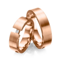 Paar Trauringe/Eheringe von acredo in Rotgold 585/- Oberfläche: längsmatt mit zus. 0,05 ct. Prinzess-Diamant tw, si (Produkt 1 mit Steinbesatz, Produkt 2 ohne Steinbesatz)